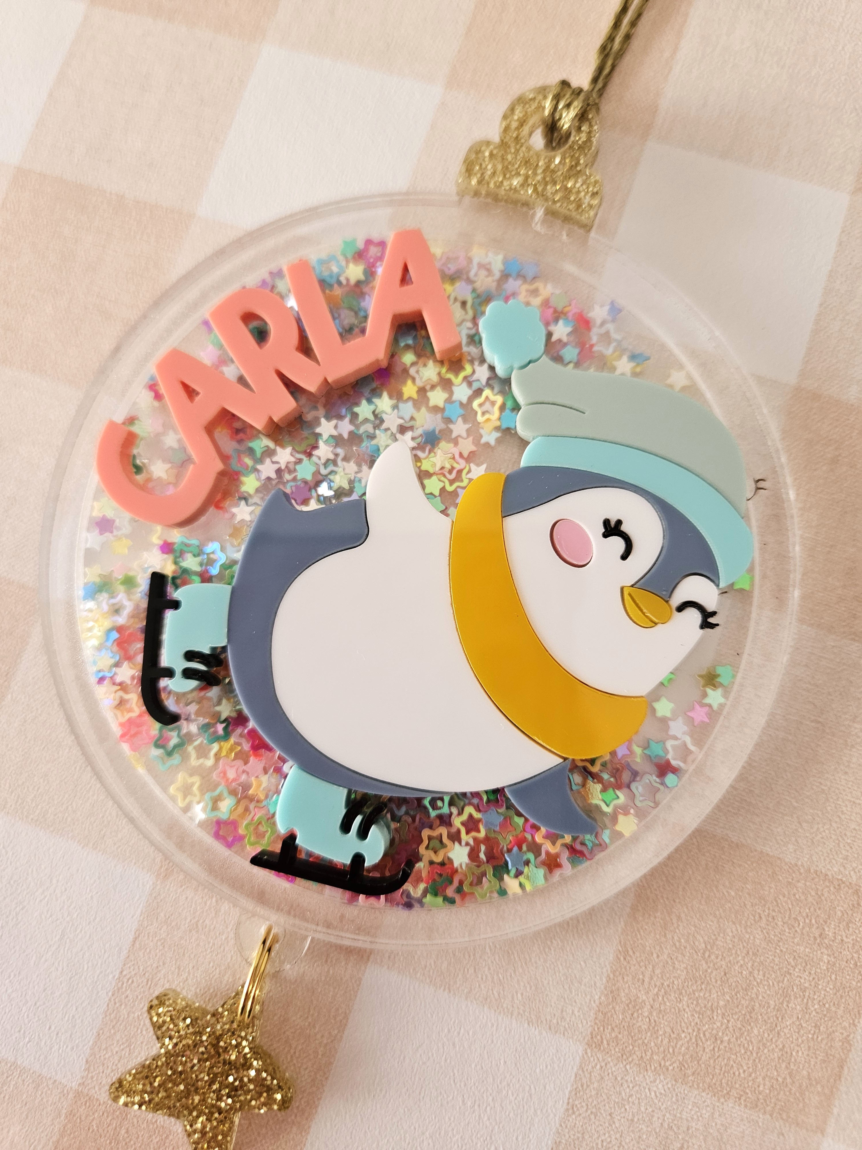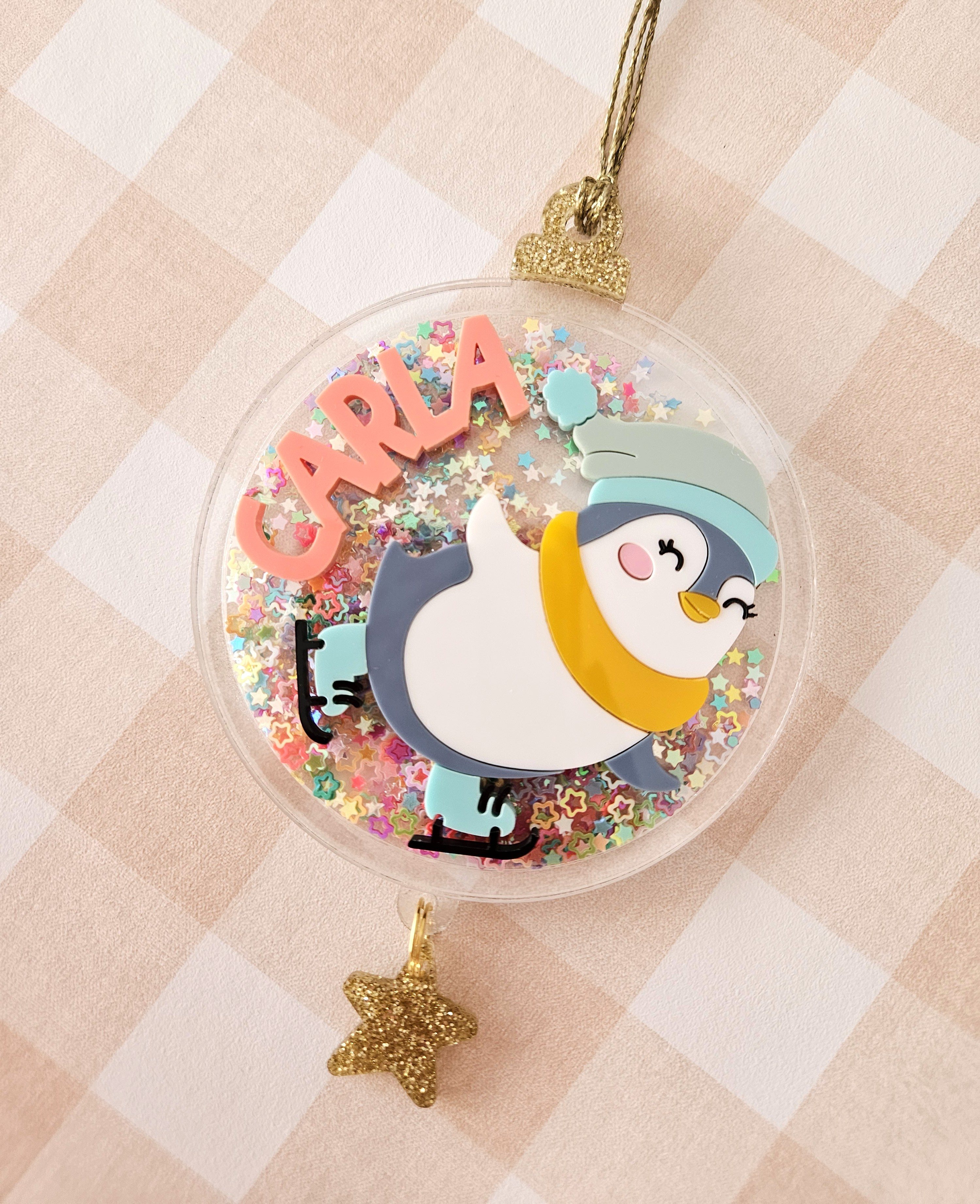 Nuestra bolita modelo pingüino, es una edición limitada y especial realizada en metacrilato transparente y colores pastel para el pingüino y el nombre. Además, lleva una estrella de glitter colgando.