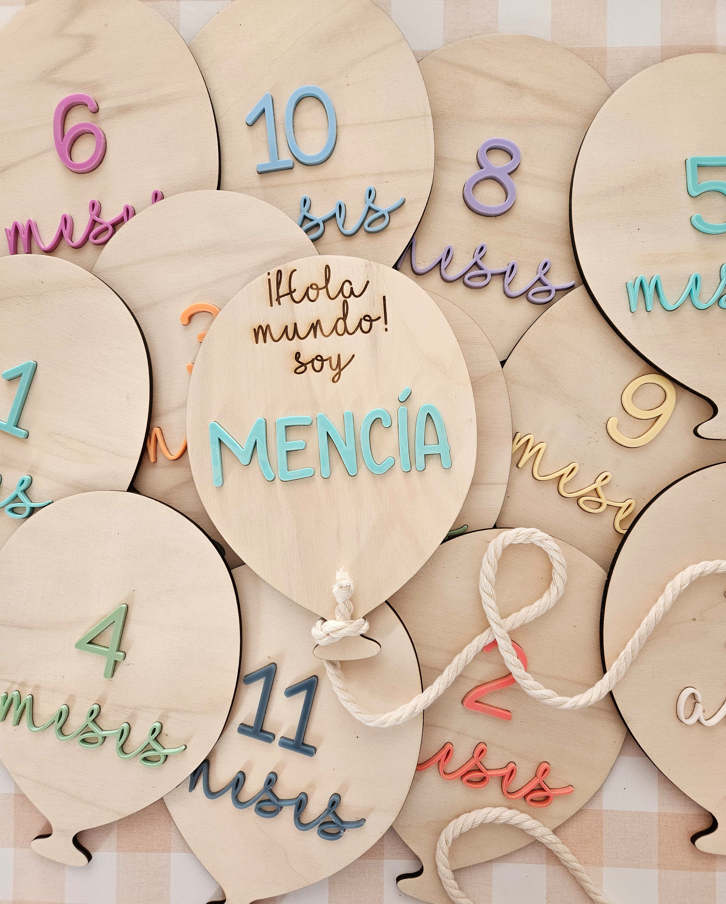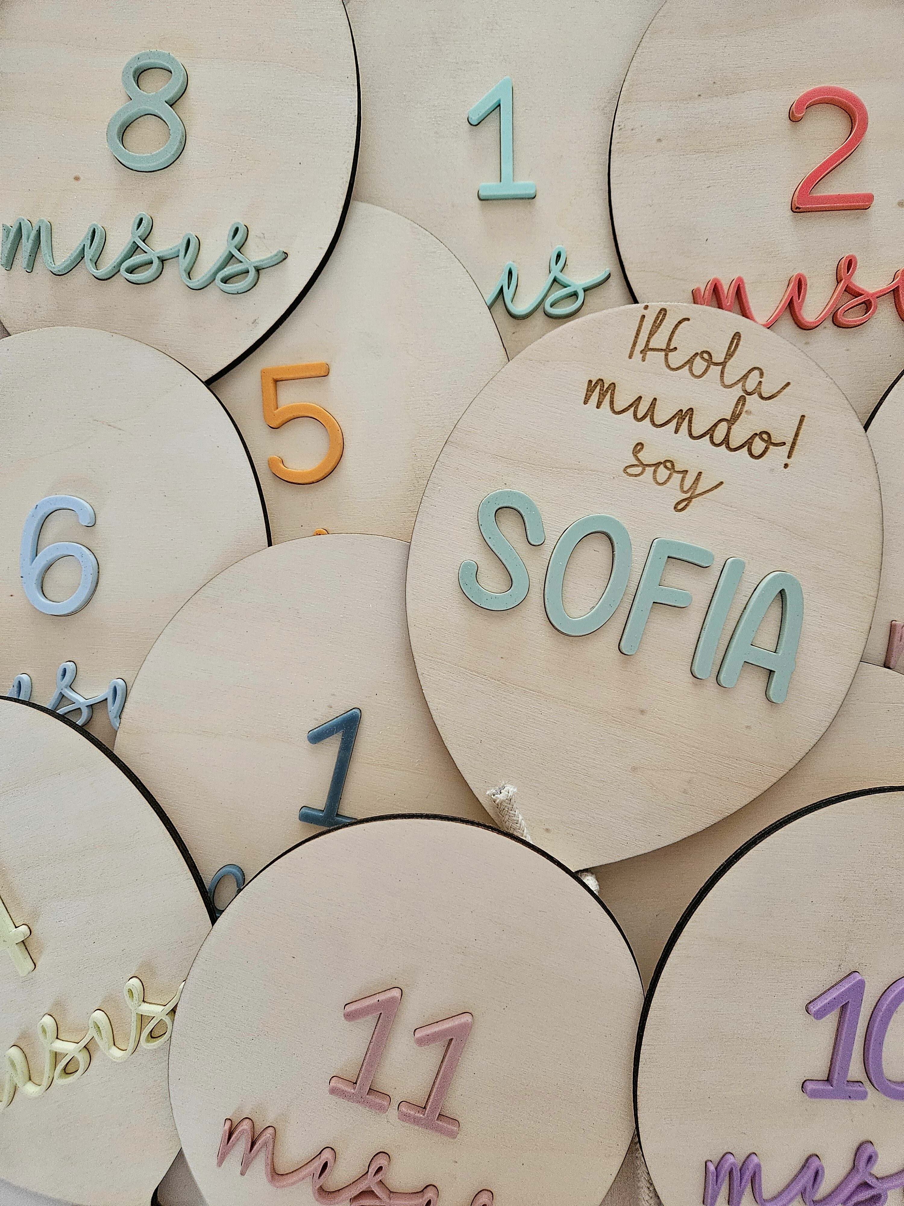 1 plaquita con la bienvenida al mundo del bebé con su nombre en metacrilato acabado brillo personalizando el color, 10 plaquitas para los siguientes meses y 1 plaquita para el año.