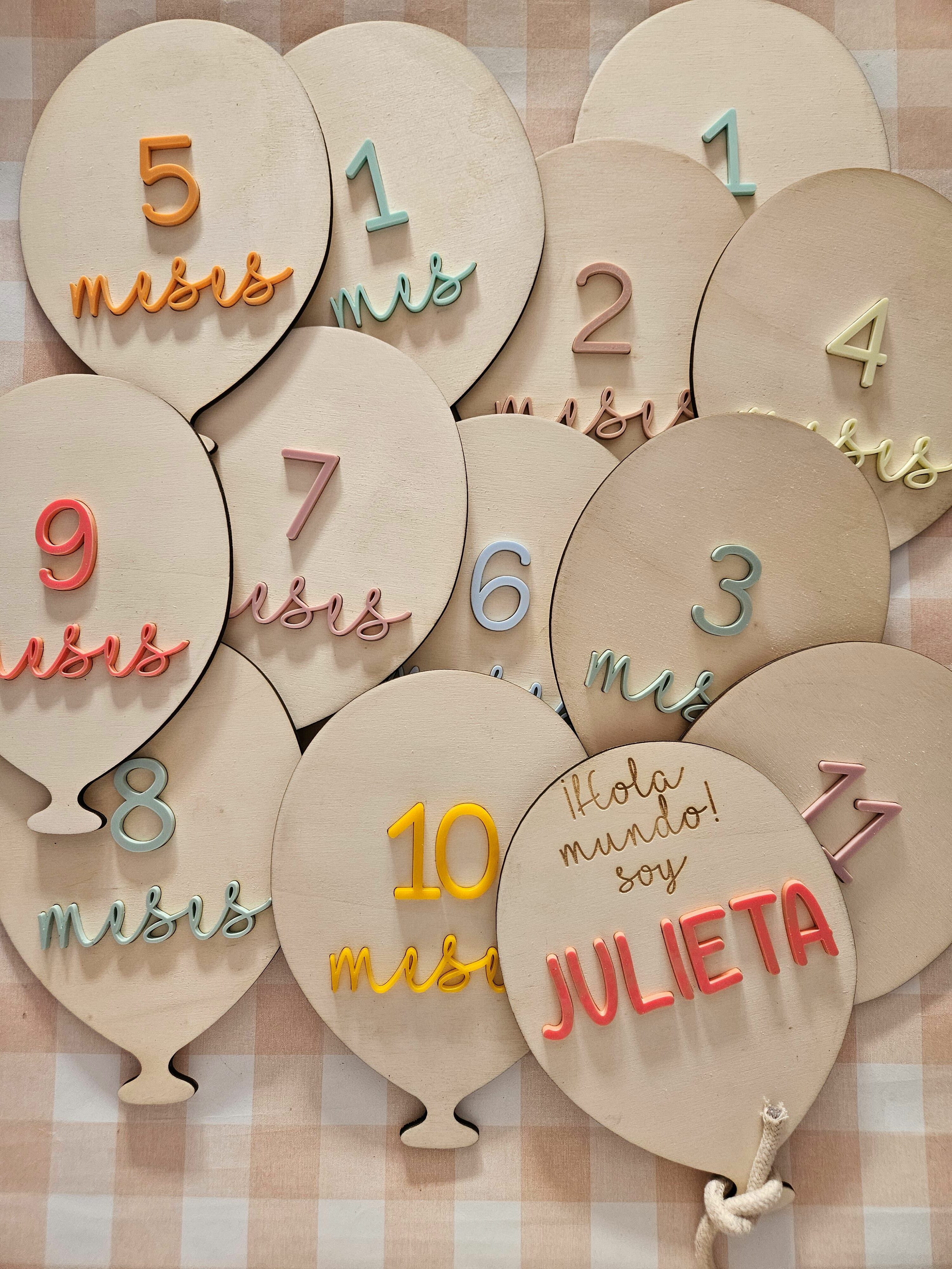 Cumplemes de plaquitas en forma de globo con números y texto en colores pastel variados.